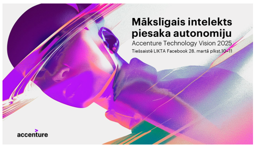 Pievienojies Accenture pētījuma “Technology Vision 2025” prezentācijai 28. martā plkst.10.00, lai uzzinātu par jaunākajām tehnoloģiju tendencēm un kā mākslīgais intelekts (MI) pārveido uzņēmumus, profesijas un ikdienas dzīvi.